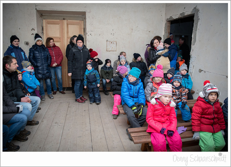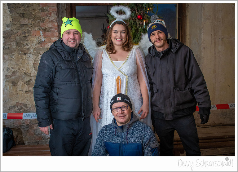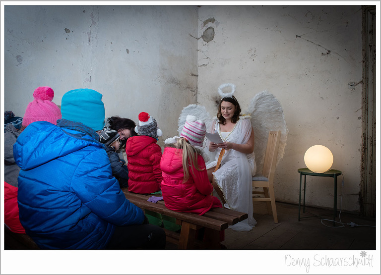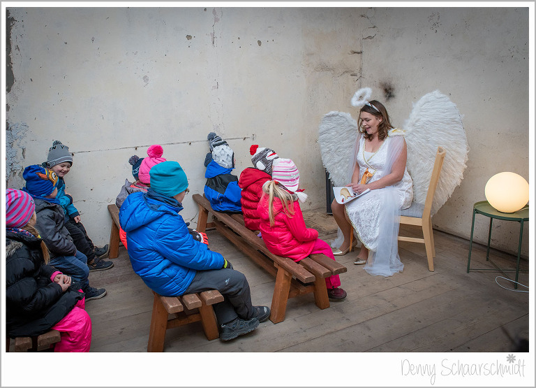 Was uns auch ganz besonders am Herzen lag, waren die Kinder. Da unsere Hochzeitsplanerin eine Menge Kontakte zu Agenturen hat, war Sie die perfekte Partnerin für diesen Bereich. So buchten wir einen Weihnachtsmann samt Engel in der Landeshauptstadt Dresden. Mitten in der Veranstaltung bekamen wir einen Anruf vom Nordpol, der Engel liegt mit einer Erkältung im Bett. Schockstarre bei der Planerin Corina. Aber das sind nicht irgendwelche Personen, sondern Profis. Schnell wurde ein Ersatz gefunden. Durch diesen kleinen Schockmoment verspätete sich das Eintreffen etwas. Die Lesung war toll, ein echtes Weihnachtsfeeling in diesen alten Gemäuern. Man sah dem nur leicht bekleideten Engel gar nicht an, dass er fror wie ein junger Hund. Schade fand ich persönlich, dass so viele Eltern ihre Kinder aus (Zeitmangel???) aus der Vorlesung holten. Liebe Eltern, das war nicht schön. Aber die Kinder, die bis zu Schluß geblieben sind, fand es sehr toll.