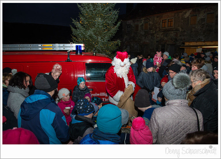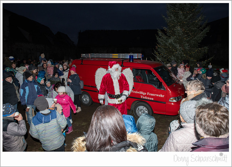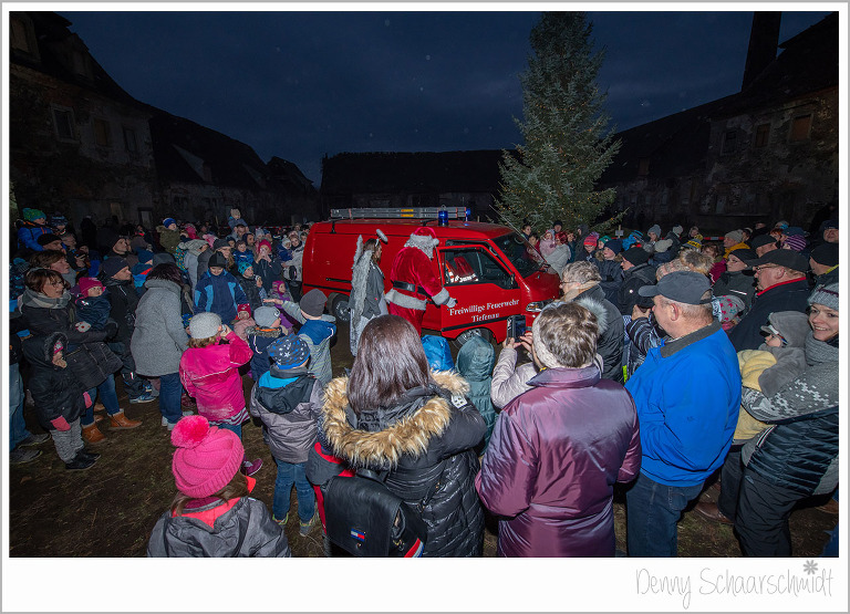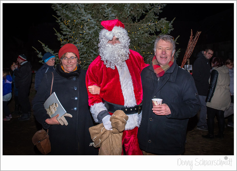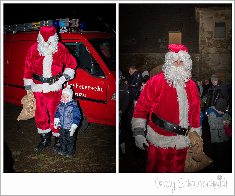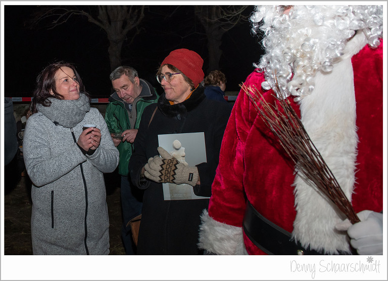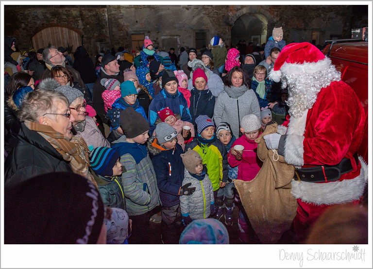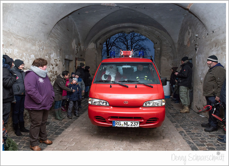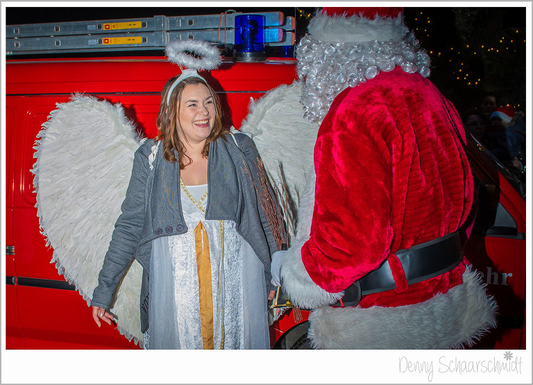 Nun war es an der Zeit das Highlight des Schlossweihnacht kommen zu lassen, den Weihnachtsmann. Wir wollten ursprünglich, dass der Knecht Ruprecht standesgemäß mit einer Pferdekutsche kommt. Leider waren unsere Bemühungen vergebens, die dafür aufgerufenen Preise der Pferdebesitzer waren Exorbitant. Und wer Hilft in schweren Fällen immer???? die Feuerwehr. Den Sack des Weihnachtsmannes hatte zuvor die Familie de Jong befüllen lassen, zu Großherzig wie sich zum Schluß rausstellte. Der Rest der Leckereien ging an einen Kindergarten.